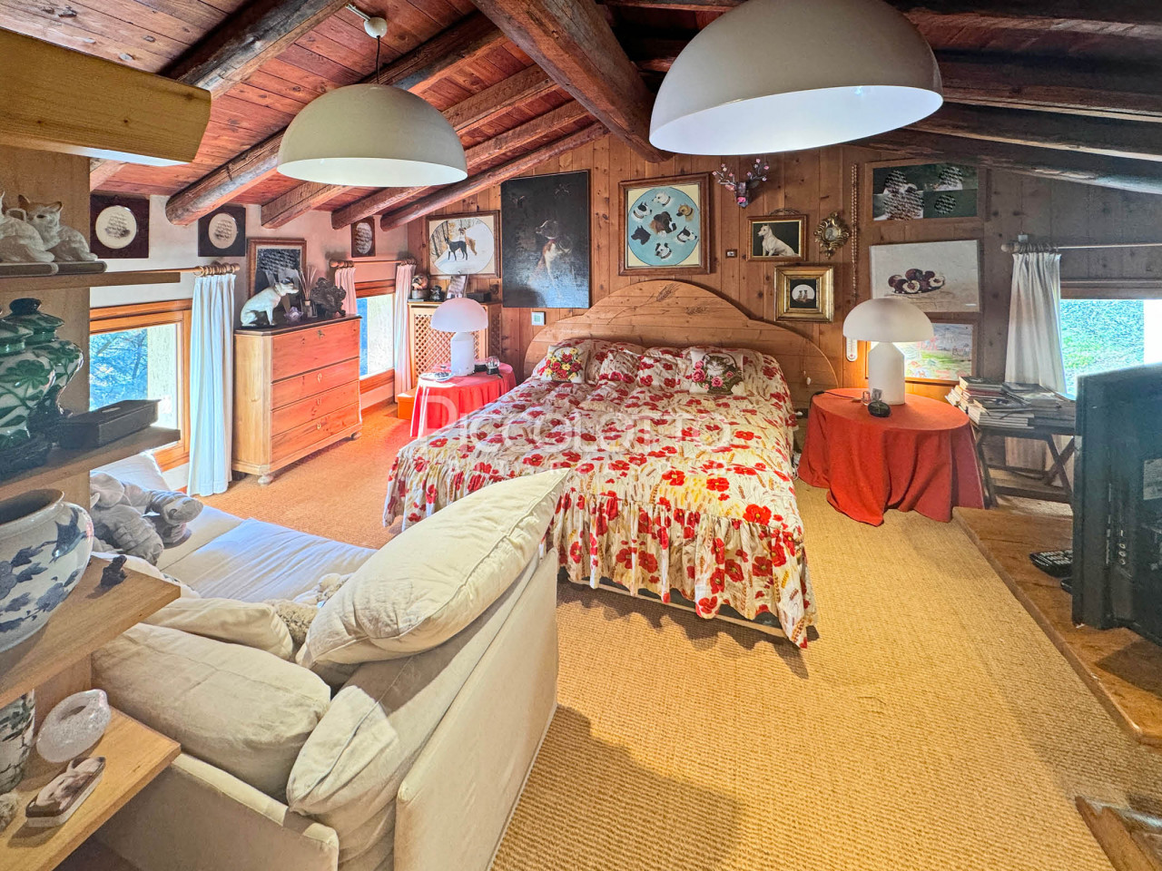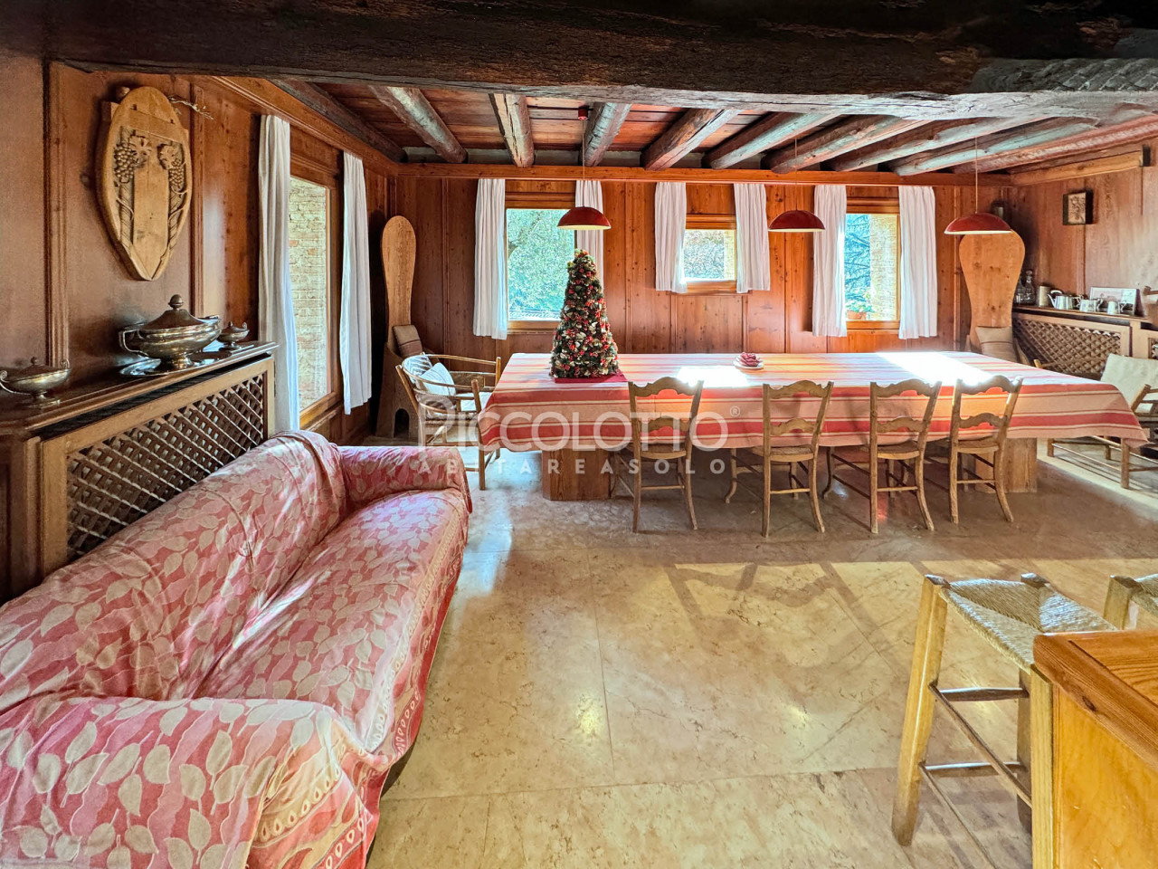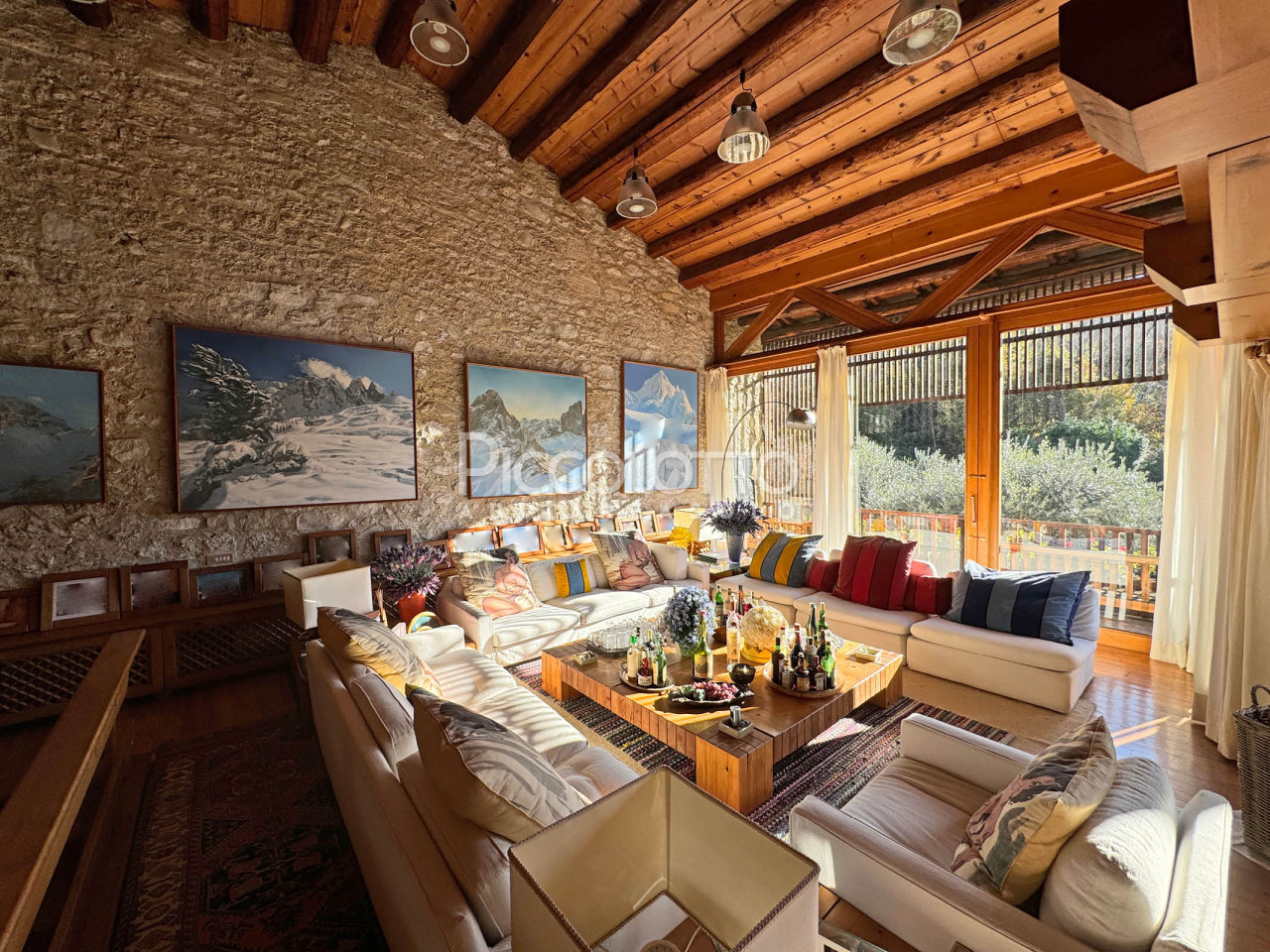 La villa di circa 600 mq è stata ristrutturata recuperando i materiali della tradizione: muratura in sasso e mattone a vista, soffitti con travi in legno, pavimenti in tavelle di cotto, pietra rosa locale e legno di larice, preziose stube in maiolica emanano un fascino antico.