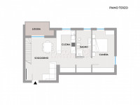 L'abitazione, caratterizzata da tetto con travatura a vista e pavimento in legno, è così composta: area living open space con soggiorno pranzo e cucina in acciaio inox, loggia, camera matrimoniale, bagno-doccia; al piano superiore, accessibile dalla scenografica scala in legno e metallo, soppalco e mansarda.