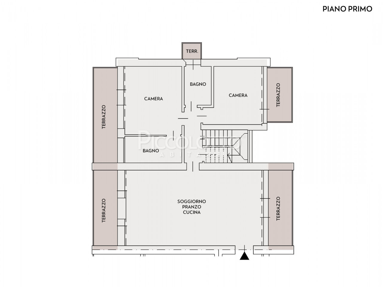 L’appartamento con superficie di circa 225 mq è così composto: piano primo ampia zona living open space, zona notte con 2 camere da letto matrimoniali, 2 bagni e ripostiglio.